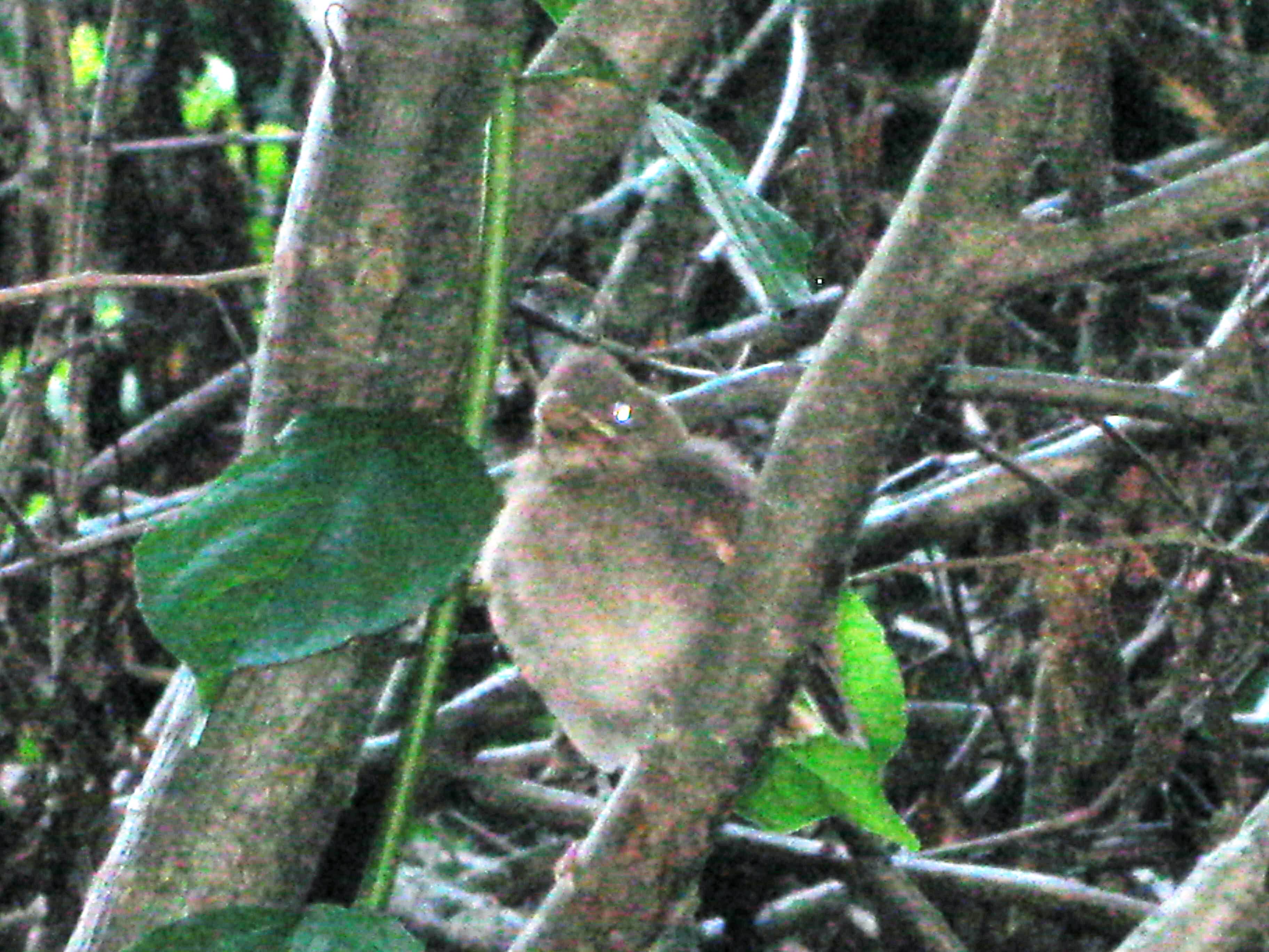 The light almost gone, and my camera settings on who knows what, I kept a good distance, but managed to get this shot of the Cardinal chick. Not a clear photo, but neither was my view.