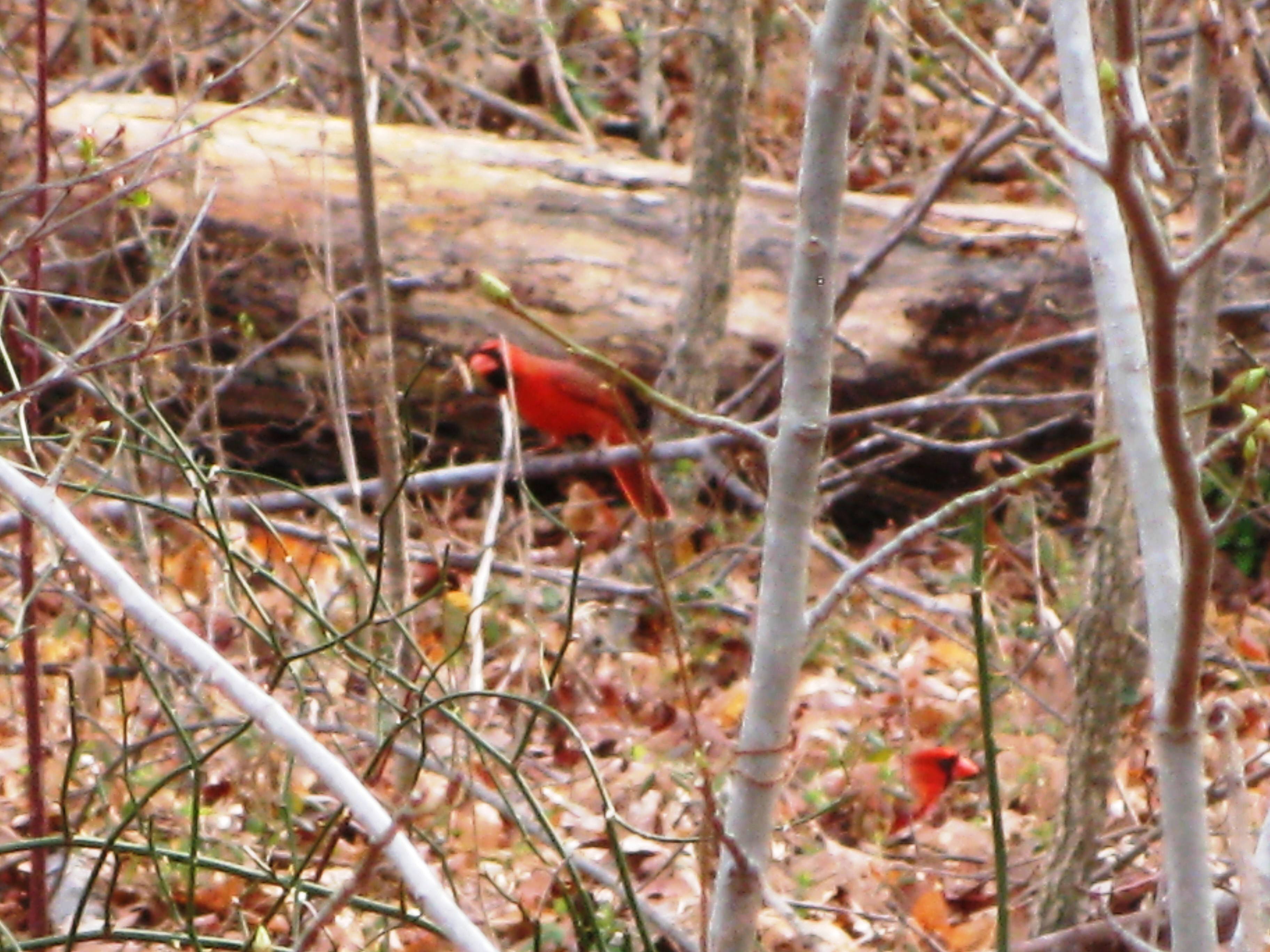 Two Male Cardinals hanging around in Winter to chase a pretty female.